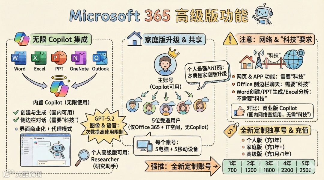 可邀请最多 5 名用户共享 Office 365 订阅(共 6 个账号,每人 1TB 存储空间),但 Copilot 功能仅主账号可用;每个账号支持登录 5 台电脑 + 5 台移动设备 -