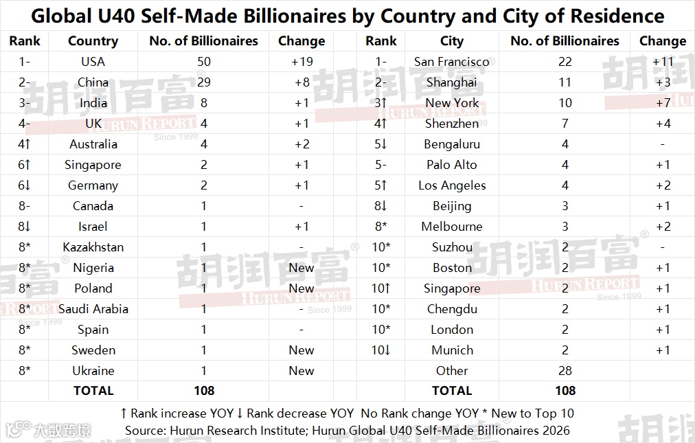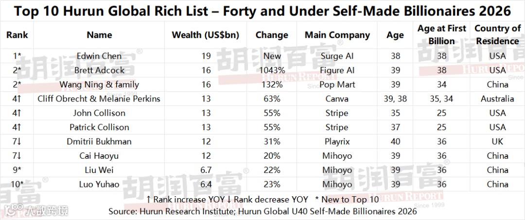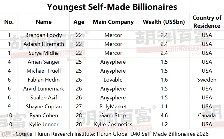 (10 March 2026, Shanghai, China, Mumbai, India, and Oxford, UK) Hurun Report today released the Hurun Global Forty and Under Self-Made Billionaires 2026, a ranking of the world’s self-made dollar billionaires aged forty or under. This is a sublist of the Hurun Global Rich List 2026, released on 5 March 2026. Wealth calculations are a snapshot of 15 January 2026. This is the 9th edition of the list, which Hurun started in 2016.