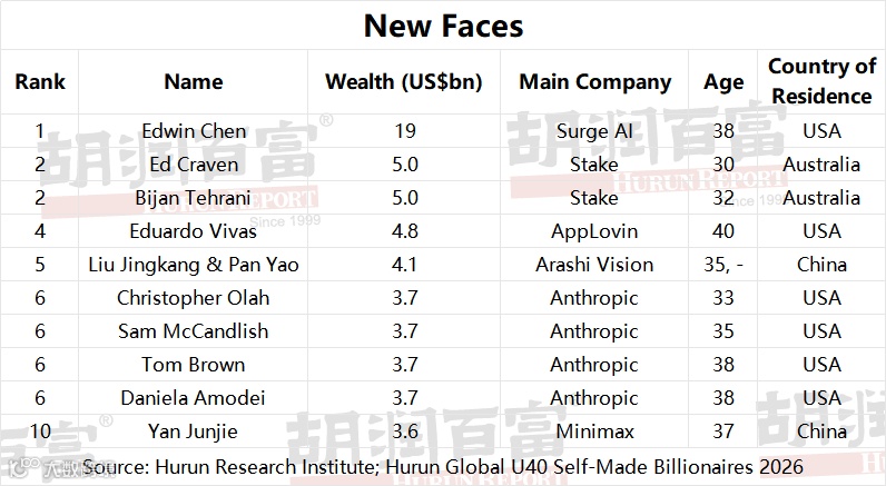 “The Hurun Under40s Self-Made Billionaires of the World tells the story of what the next generation of entrepreneurs are making their money in. We found 108 self-made billionaires in the world, and for the first time, Artificial Intelligence is the number one wealth-creating sector, accounting for 27 billionaires with a combined wealth of nearly US$100bn. At the top of the list sits Edwin Chen of Surge AI with US$19bn, followed by Brett Adcock of humanoid robotics company Figure AI at US$16bn — up an extraordinary eleven-fold in a single year. These 108 individuals have already created huge wealth at such a young age. How big can they get by the time they reach the age of Elon Musk, Jensen Huang or Warren Buffett, and what will they do with all that wealth? Give it to charity, invest it in the next wave of entrepreneurs, or pass it to their children? Hurun promotes entrepreneurship through its lists and research, and this list exists to inspire the next generation to learn from the world's most successful young entrepreneurs.”