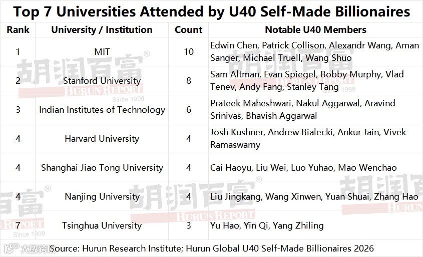 MIT and Stanford together account for 18 U40 self-made billionaires, reflecting the disproportionate share of STEM-focused elite institutions. IIT (India) contributes 6 members across its network of campuses. Shanghai Jiaotong University and Nanjing University lead for China.