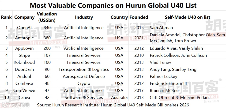TOP TEN MOST VALUABLE COMPANIES CO-FOUNDED BY A HURUN U40 SELF-MADE BILLIONAIRE COLLECTIVELY WORTH US$1.8 TRILLION, LED BY OPENAI (US$840BN), ANTHROPIC (US$380BN), APPLOVIN (US$200BN), STRIPE (US$107BN), ROBINHOOD (US$100BN), AND DOORDASH (US$90BN).