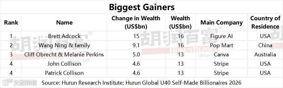 Brett Adcock of Figure AI recorded the most dramatic gain, with his wealth rising US$14.6bn to US$16bn, driven by explosive investor appetite for humanoid robotics. Wang Ning & family of Pop Mart climbed US$9.1bn to US$16bn on the back of the global phenomenon of the Labubu collectible toy range. The Collison brothers each added US$4.6bn as Stripe consolidated its position as the backbone of digital payments infrastructure.