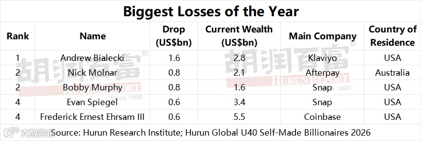 14 individuals saw their wealth fall, of which one dropped off the list completely. The largest drop belonged to Andrew Bialecki of email marketing platform Klaviyo, whose wealth fell by US$1.6bn to US$2.8bn. Nick Molnar of Afterpay and Bobby Murphy of Snap each lost US$0.8bn. Shares of ad-reliant technology companies continued to face pressure following Apple's privacy changes, with Snap's Bobby Murphy and Evan Spiegel each recording declines.