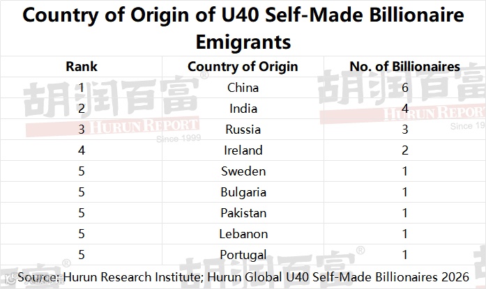 23 individuals representing 21% of the Hurun Global U40 Self-Made Billionaires 2026 were born and raised in a country different from where they reside today. These immigrant billionaires overwhelmingly chose the USA as their adopted home (14), followed by the UK and Singapore (2 each). They came primarily from China (6), India (4), and Russia (3), with Ireland contributing 2.