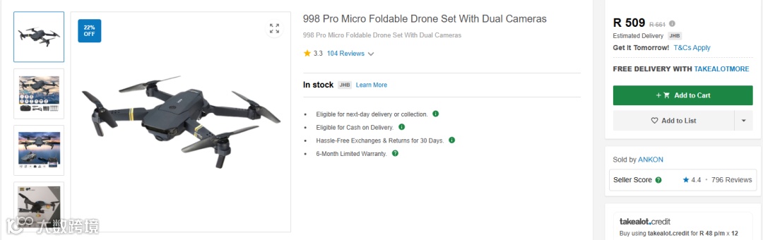 - 淘宝 60 元的航拍无人机,这里卖 509 兰特(约 219 元),平台相关产品仅 270 个,一款104条评价的无人机,按 8% 留评率反推,实际销量超 1000 件。