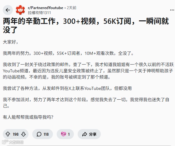 某创作者仅运营一个YouTube频道,却收到YPP取消通知,理由是“与违规频道存在关联”。其本人并无其他频道,无法定位所谓“关联方”,陷入申诉无门的困境。
