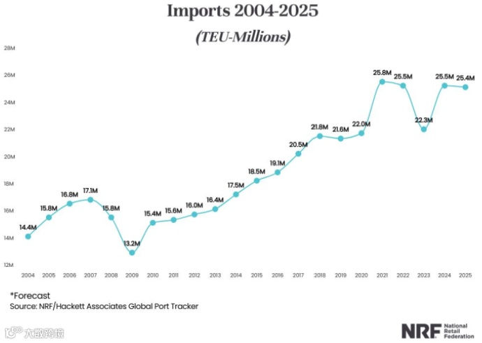 美国集装箱进口量走势(2004—2025年)来源:NRF/Hackett Associates《Global Port Tracker》)