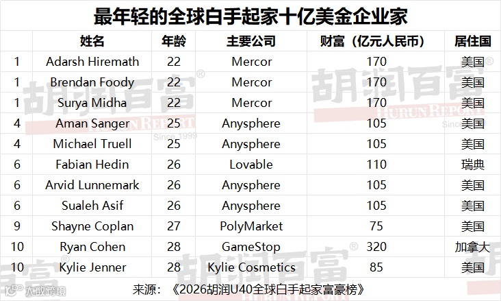 全球最年轻的白手起家十亿美金企业家:三位住旧金山的22岁年轻人——AI招聘平台Mercor的Brendan Foody、Adarsh Hiremath与Surya Midha,三人各持170亿元人民币财富;以及两位25岁年轻人 —— AI编程工具Anysphere的Aman Sanger与Michael Truell,二人各持105亿元人民币财富