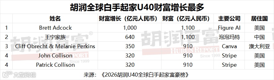 Figure AI的Brett Adcock财富涨幅最为惊人,受人形机器人领域投资热潮推动,其财富暴涨1000亿元至1100亿元人民币;泡泡玛特的王宁家族受Labubu潮玩全球爆火的带动,财富大涨640亿元至1100亿元人民币;Stripe的Collison兄弟稳居数字支付基础设施领域头部,二人各财富增长320亿元人民币。