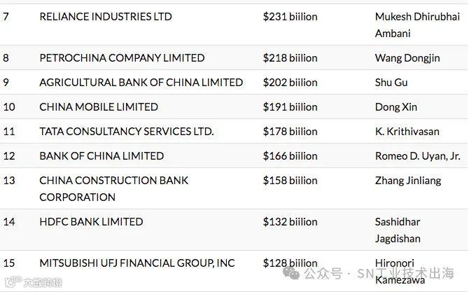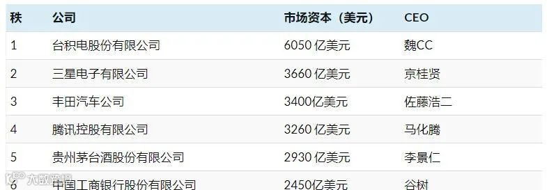 在亚洲企业市值排行榜上,腾讯控股有限公司以3,260亿美元市值位列第四,显示出其在互联网服务及数字娱乐领域的广泛影响;贵州茅台则以2,930亿美元市值稳居第五,彰显奢侈品牌在资本市场的强劲表现。