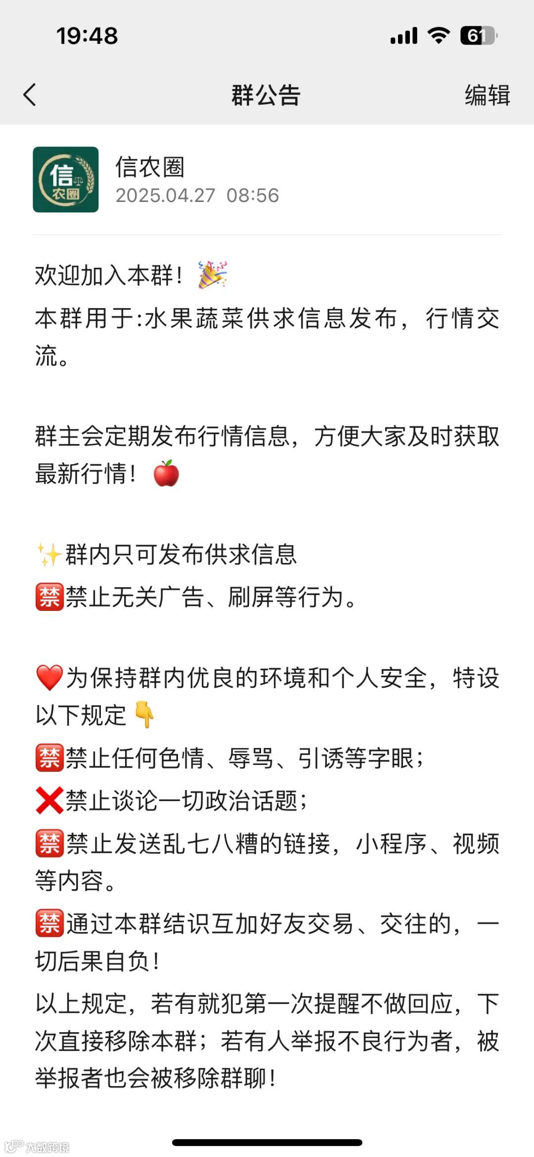 客服微信:仅限从事农业、农产品、种植、代办代发、批发、代卖、加工厂、种苗、农资、供应链、实体商超、零售摆摊、生鲜电商、冷库、贸易商、合作社、食堂、餐饮业、畜牧业、等与农业相关或农产品流通环节行业的从业者进群,无关人员不要加,加了也不会拉,无关人员勿扰!