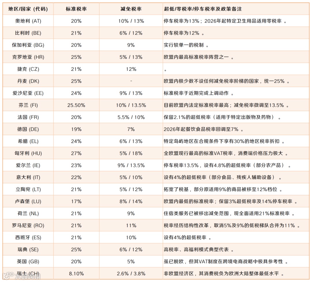 表2:2026年初欧洲主要国家的法定VAT税率结构