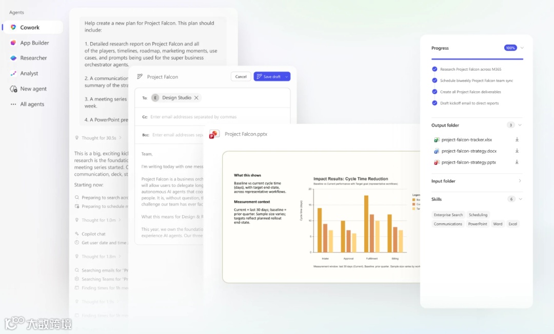 它从邮件、会议纪要、共享文档中提取关键信息,在日历中预留准备时段,并生成联动交付物:会议简报、支撑性分析材料、面向客户的演示文稿。所有成果统一保存于 Microsoft 365,支持团队实时协同完善。