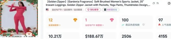 据海邑省心研究队监测,一款金色拉链运动套装(瑜伽夹克+紧身瑜伽裤)近期在TikTok美区持续走红。该产品7天GMV超660万元,近一个月售出超6万件,销售额突破千万元,并连续多周稳居运动与户外类目销量榜首。