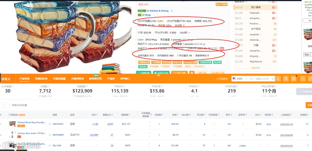 单量:在卖家精灵中显示上架时间是2025年05年18号,目前为止持续销售31天,30天销售量(4057单),子体(+)