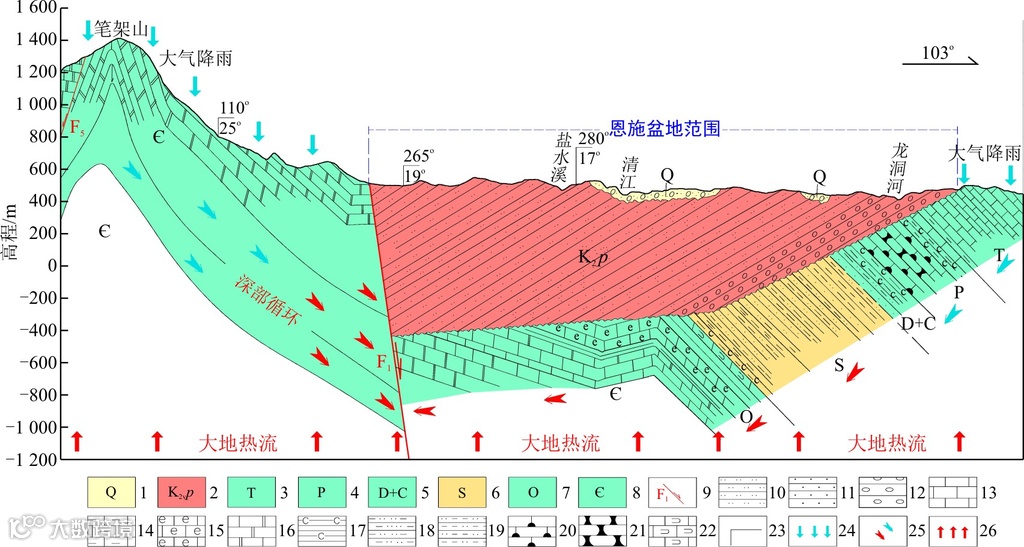 1.第四系弱含水层;2.白垩系跑马岗组(盖层);3.三叠系碳酸盐岩含水层;4.二叠系碳酸盐岩含水层;5.石炭系-泥盆系碳酸盐岩层;6.志留系砂岩层(隔水层);7.奥陶系碳酸盐岩层(热储层);8.寒武系碳酸盐岩层(热储层);9.恩施大断裂;10.粉砂岩;11.砂岩;12.砾岩;13.灰岩;14.泥质灰岩;15.生物碎屑灰岩;16.云质灰岩;17.炭质泥岩;18.泥质粉砂岩;19.粉砂质泥岩;20.燧石结核灰岩;21.瘤状灰岩;22.龟裂纹灰岩;23.地层产状;24.大气降水;25.冷(热)水流向;26.大地热流