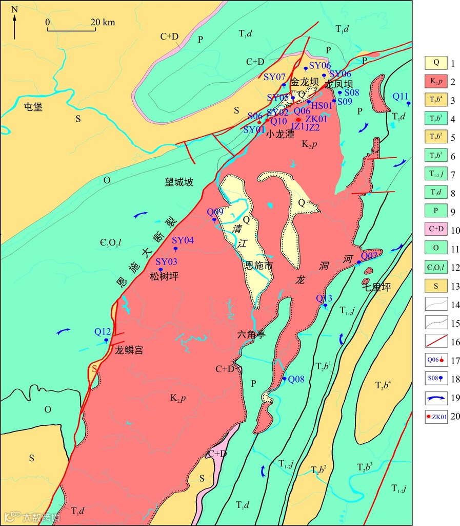 1.第四系松散岩类孔隙弱含(透)水层;2.上白垩统跑马岗组砂岩裂隙相对隔水层;3.中三叠统巴东组四段砂页岩隔水层;4.中三叠统巴东组三段岩溶裂隙含水层;5.中三叠统巴东组二段砂页岩隔水层;6.中三叠统巴东组一段岩溶裂隙含水层;7.下-中三叠统嘉陵江组岩溶裂隙含水层组;8.下三叠统大冶组岩溶裂隙含水层组;9.二叠系碳酸盐岩岩溶裂隙含水层组;10.石炭系-泥盆系砂岩裂隙弱含水层组;11.奥陶系碳酸盐岩岩溶裂隙含水层;12.上寒武统-下奥陶统娄山关组岩溶裂隙含水层;13.志留系隔水层;14.地质界线;15.角度不整合地质界线;16.断层;17.热泉取水样点;18.冷泉、河水取水样点;19.推测地下水流向;20.地热钻孔取样点