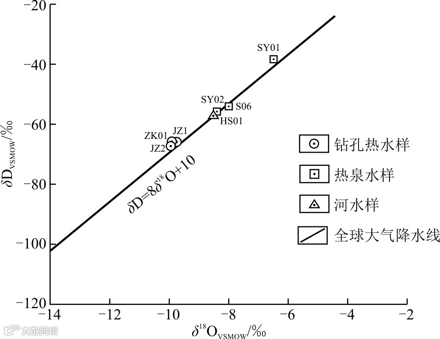 图3 河水、热泉水、钻孔热水样品δD–δ¹⁸O关系图