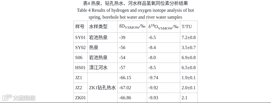 热泉氚浓度为3.5~7.2 TU,河水为6.5±0.8 TU,钻孔热水为1.9~2.1 TU。根据经验标准,热泉为新近入渗水与“古水”的混合水,钻孔热水则以60年前的“古水”为主。