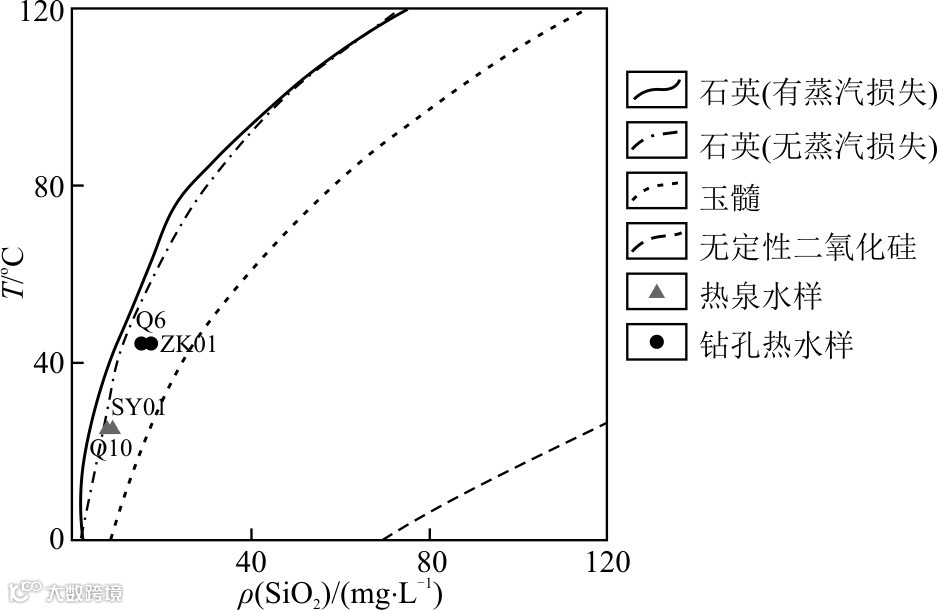 SiO₂溶解度曲线显示,热泉水与钻孔热水点靠近石英(无蒸汽损失)曲线,表明SiO₂浓度受石英溶解平衡控制,适宜采用石英温标。