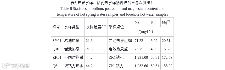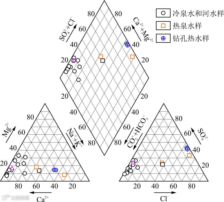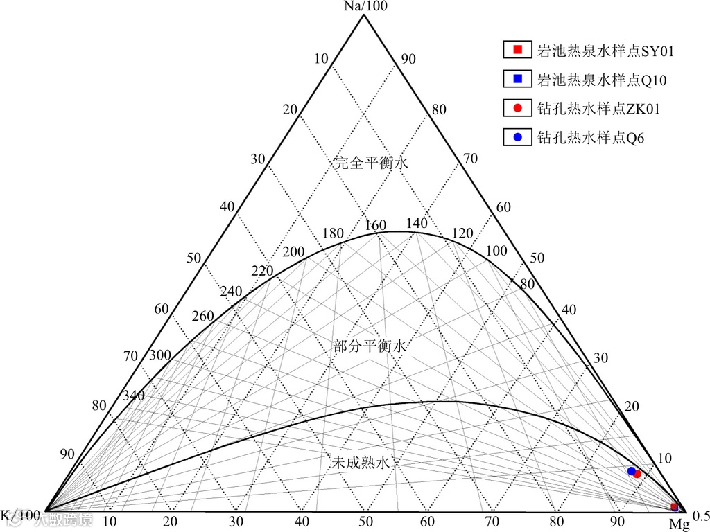 Na-K-Mg三角图显示所有水样位于未成熟水区,说明水–岩作用尚未平衡,或存在浅层冷水混入,使用阳离子地温计将产生较大偏差。