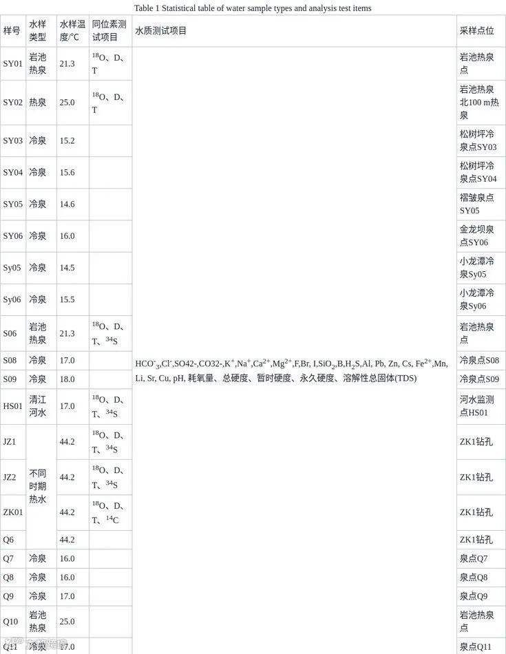 冷泉与河水离子浓度相近,阳离子以Ca²⁺为主,阴离子以HCO₃⁻为主;岩池温泉水离子浓度略高于地表水,但远低于SY02热泉;SY02热泉及钻孔热水Na⁺、Cl⁻、SO₄²⁻等离子浓度显著偏高,表明其为深部高温水,而岩池温泉可能为冷热混合水。