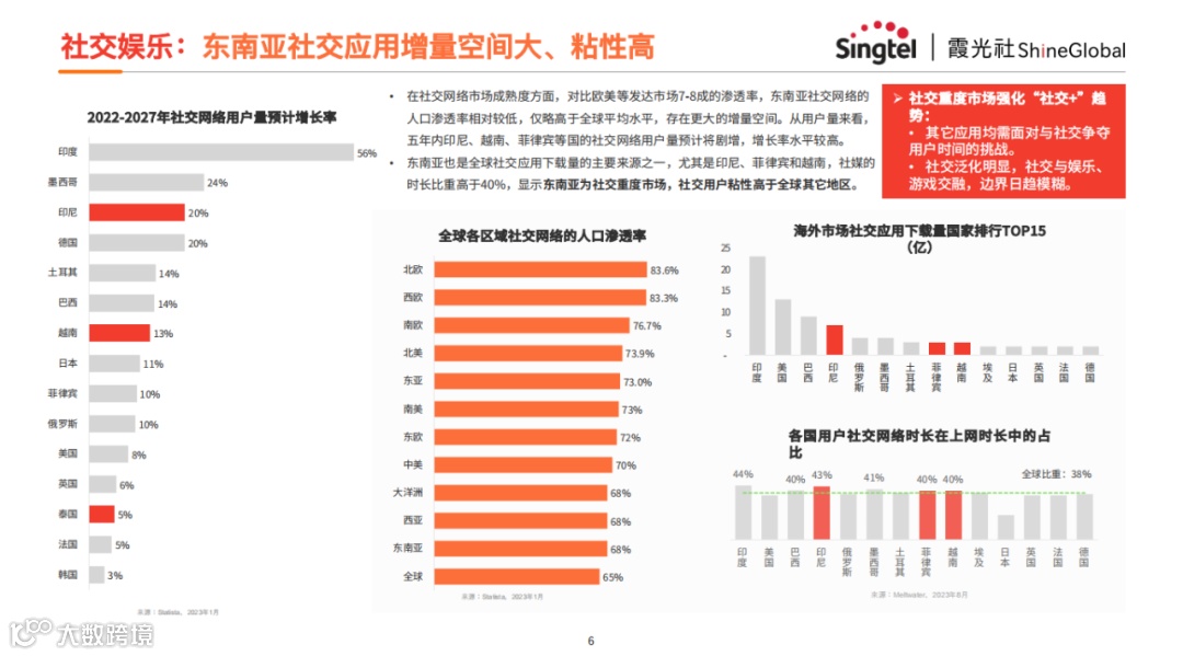东南亚社交网络的人口渗透率相较于欧美发达市场(7-8成渗透率)较低,略高于全球平均水平。印尼、越南、菲律宾等国的社交网络用户量预计在未来五年内将剧增,增长率较高。东南亚社交媒体的时长比重高于40%,是社交重度市场。