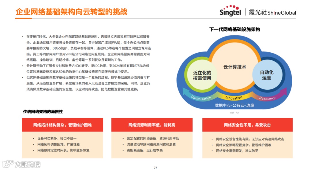 传统IT时代,企业多建立内部私有互联网保障安全,需配置复杂网络基础设施,员工需通过VPN访问互联网,工作繁琐,而云计算转变了IT服务交付和消费方式。当前,实体向数字基础设施转型复杂,需具备可扩展性以适应业务扩展和混合工作模式,同时确保安全性以应对网络攻击等威胁。报告还针对新加坡电信公司的各种成功案例进行了分析,可以下载原文,查看完整报告。