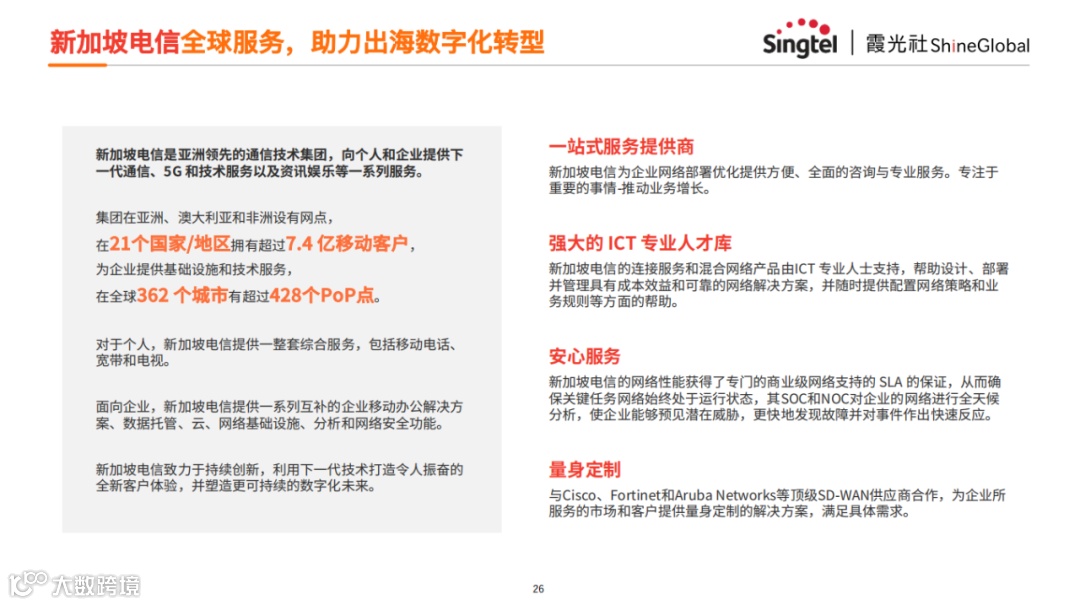 新加坡电信是亚洲领先的通信技术集团,提供5G、通信、技术服务及资讯娱乐等服务,业务遍布亚洲、澳大利亚和非洲21国,目前拥有超7.4亿移动客户,全球362城设超428个PoP点。