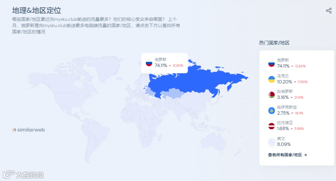 约90%的流量来自俄罗斯、乌克兰和白俄罗斯等地。数据显示,速卖通承接了Mysku.ru导出流量的25%,且这一比例呈上升趋势。