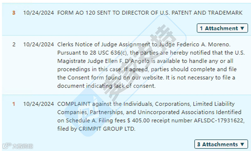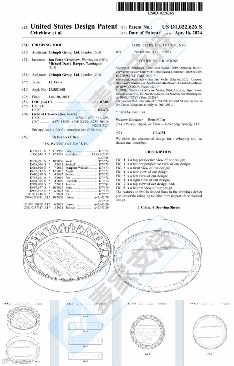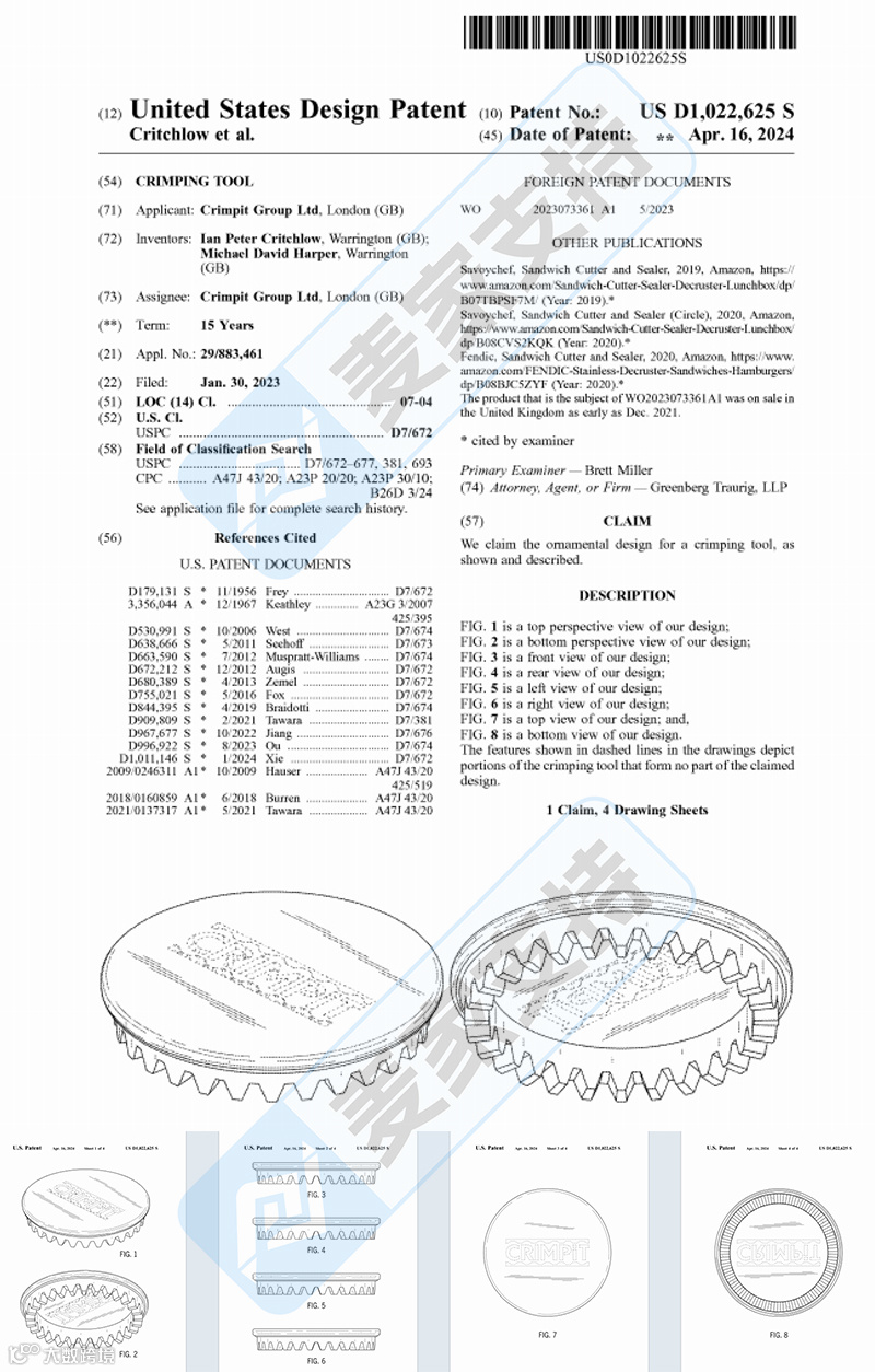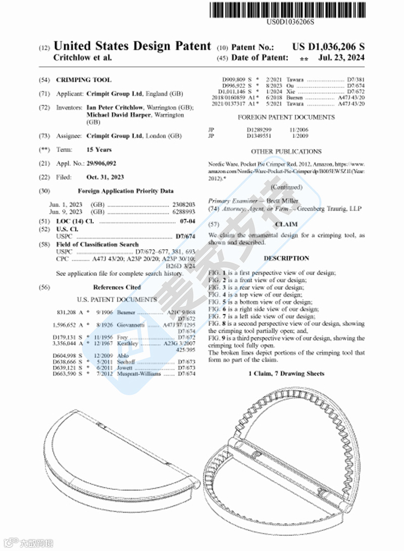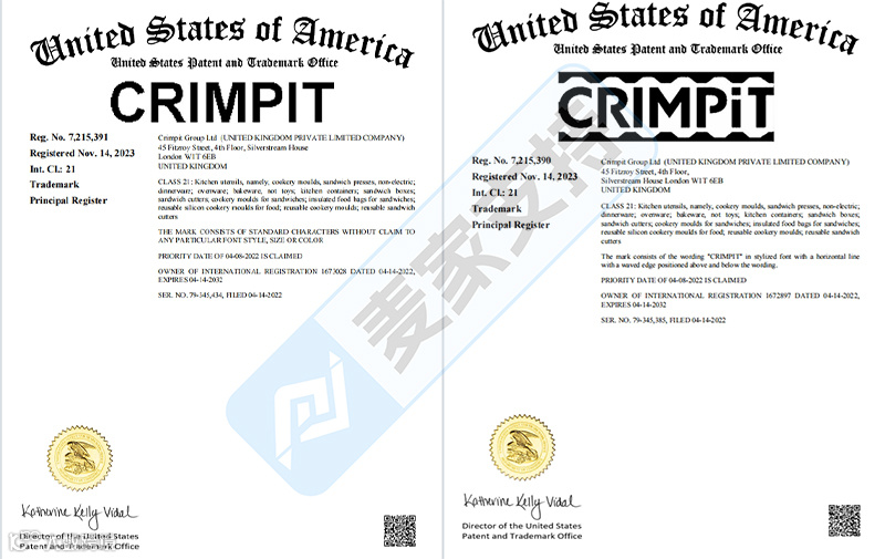 BSF律所美国时间10月24日连起三案,均涉及商标维权,本案是针对Crimpit Group Ltd.公司2023年11月在美国下证的CRIMPIT商标发起的维权案,麦家支持检索发现,该商标注册在第21大类,主要涉及厨房用具、烹饪模具、三明治压制机等。由于CRIMPIT有皱缩、卷曲、压制等意思,及其容易被误用,故而麦家支持友情提醒卖家朋友在listing中用词需谨慎,避免因误用导致TRO冻结。除此之外Crimpit Group Ltd.在美国还布局有多个压接工具的外观专利,卖家均需留意。