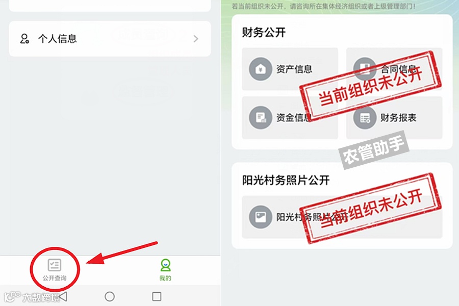 2、进入农村集体组织查询入口,参考农管助手图示步骤,点击“公开查询”,查看农村集体资产信息、合同信息、资金信息、财务报表等三资公开信息。