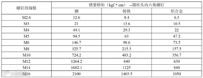 常用固定螺丝锁紧扭矩参考