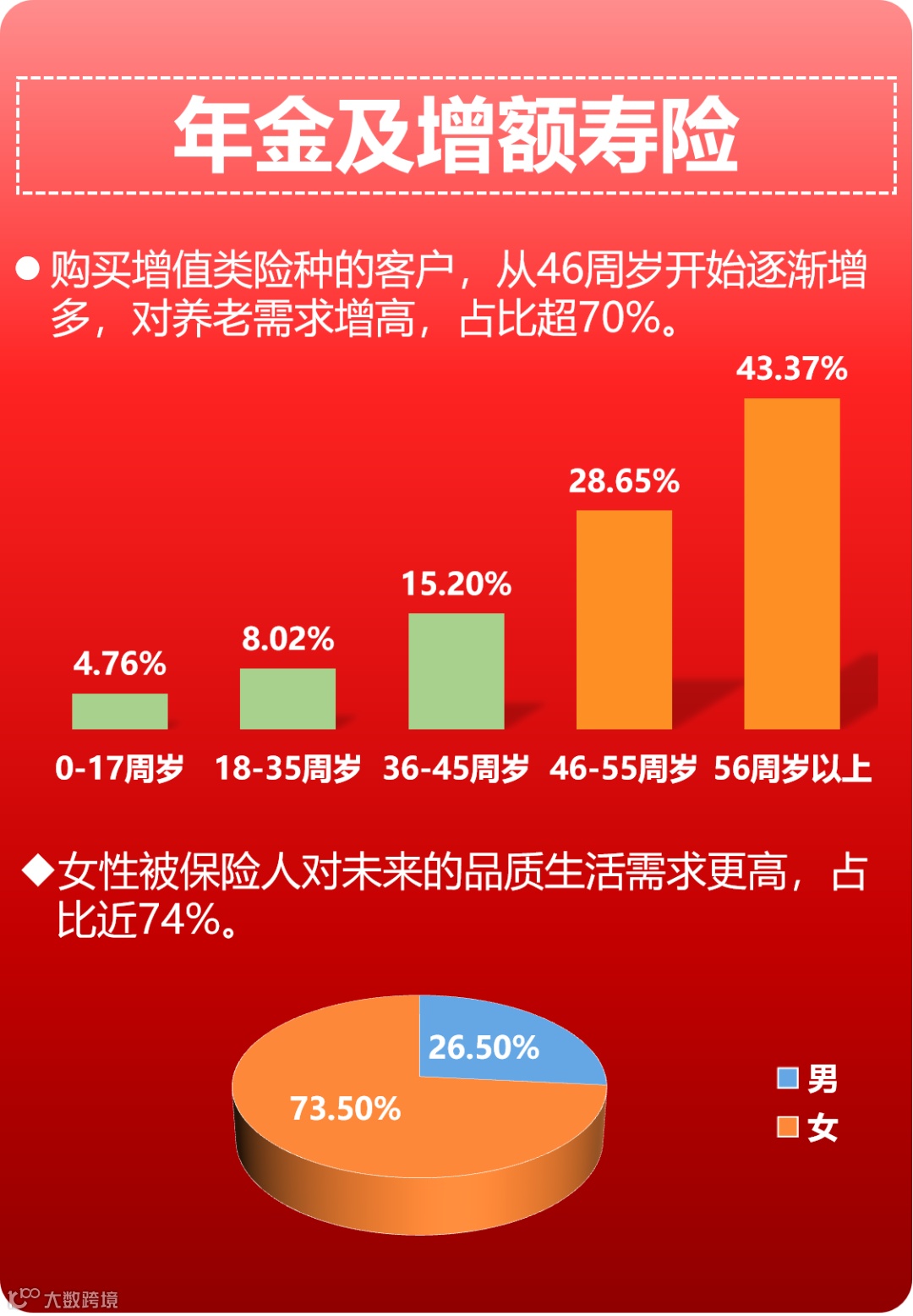 年轻人更关注医疗保障类产品,增值类、长期护理类产品更受到年长客户的青睐。重疾险平均投保年龄25.12岁;增额寿险及年金险平均投保年龄50.73岁;护理险平均投保年龄49.18岁,客户投保年龄稳定在50周岁左右。