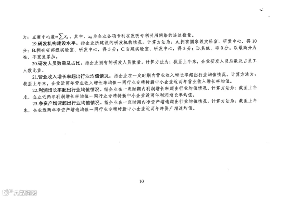 21.营业收入增长率超出行业均值情况:指企业在一定时期内营业收入增长率超出行业均值情况。计算方法为:截至上年末,企业近两年营业收入增长率均值一同行业专精特新中小企业近两年营业收入增长率均值。
