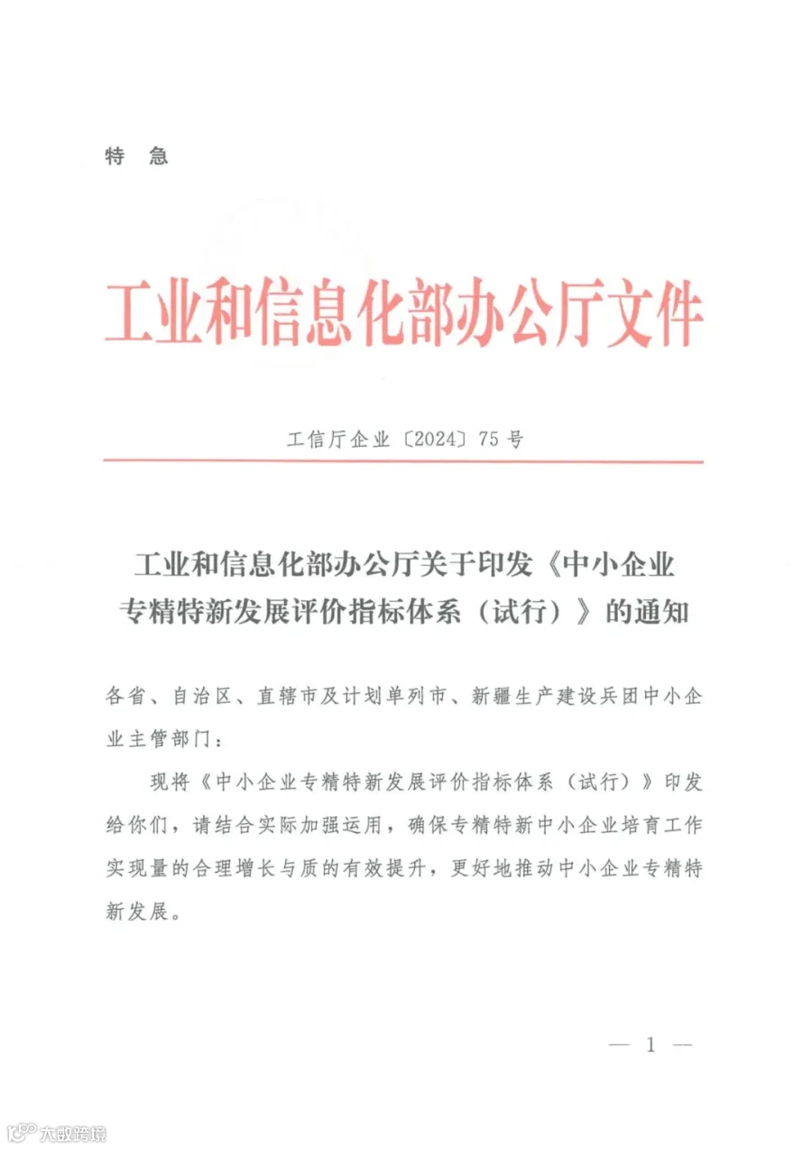 现将《中小企业专精特新发展评价指标体系(试行)》印发给你们,请结合实际加强运用,确保专精特新中小企业培育工作实现量的合理增长与质的有效提升,更好地推动中小企业专精特新发展。