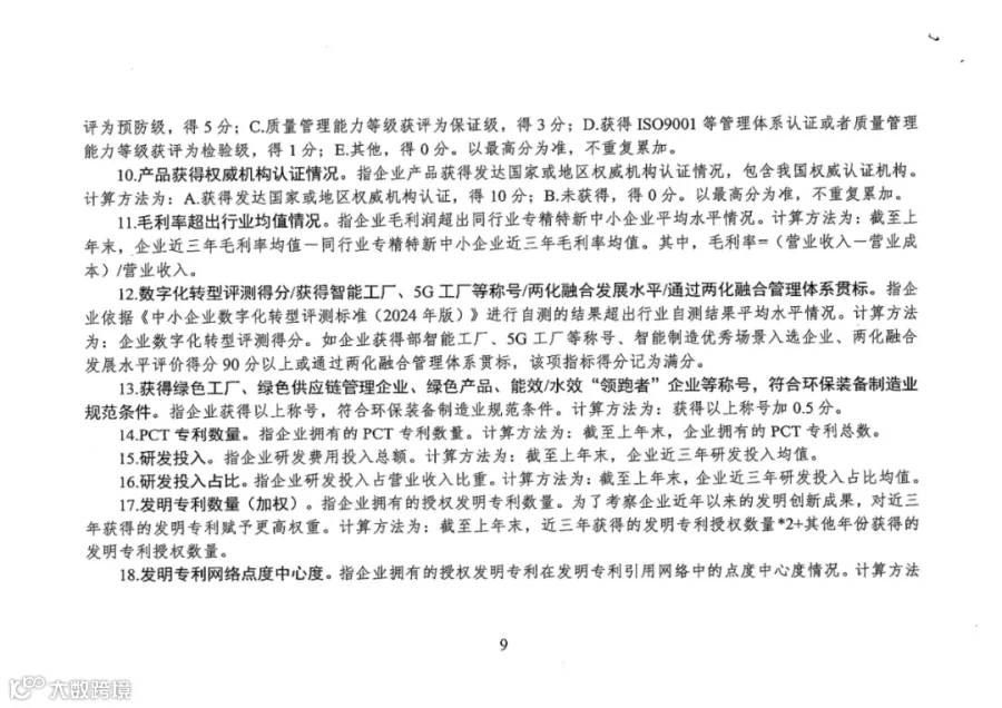 计算方法为:企业数字化转型评测得分。如企业获得部智能工厂、5G工厂等称号、智能制造优秀场景入选企业、两化融合发展水平评价得分90分以上或通过两化融合管理体系贯标,该项指标得分记为满分。