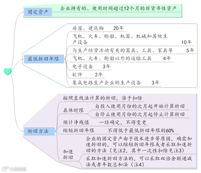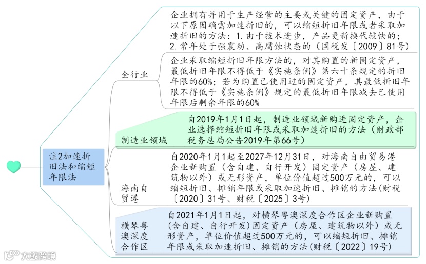 【备注2】采取加速折旧方法的,可以采用双倍余额递减法或者年数总和法。加速折旧方法一经确定,一般不得变更。