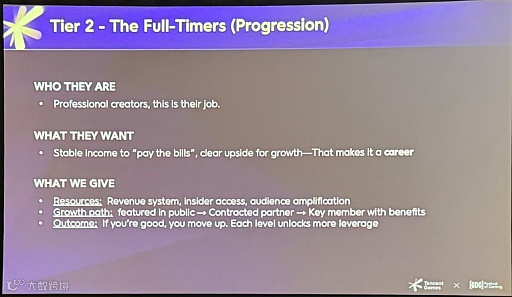 对于职业内容创作者,团队则提供更加稳定的支持,包括高于行业平均水平的收益分成、测试服务器的提前访问资格,以及游戏内的推广位置。