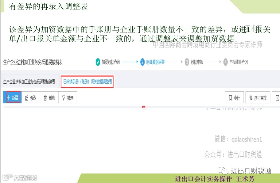 若有差异或者加贸数据中没有手账册和报关单数据的,则需要录“已核销手(账)册海关数据调整表”(没有差异的忽略本步),该调整表的用途就是补充企业有但税局没有的数据,或者企业与税局不一致的数据,进行补充核销。