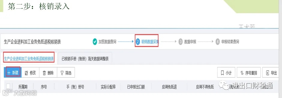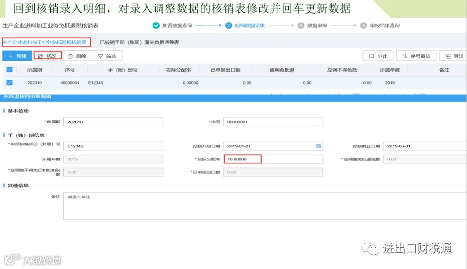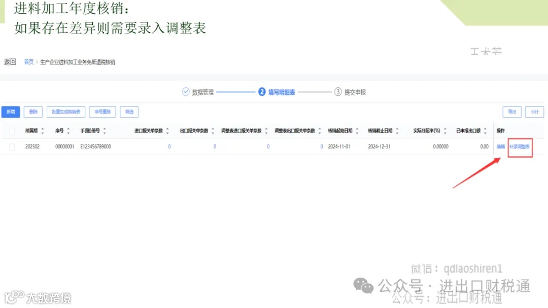 2.进行核销数据录入,若有与加贸数据不符的报关单,则在调整表中直接调整;