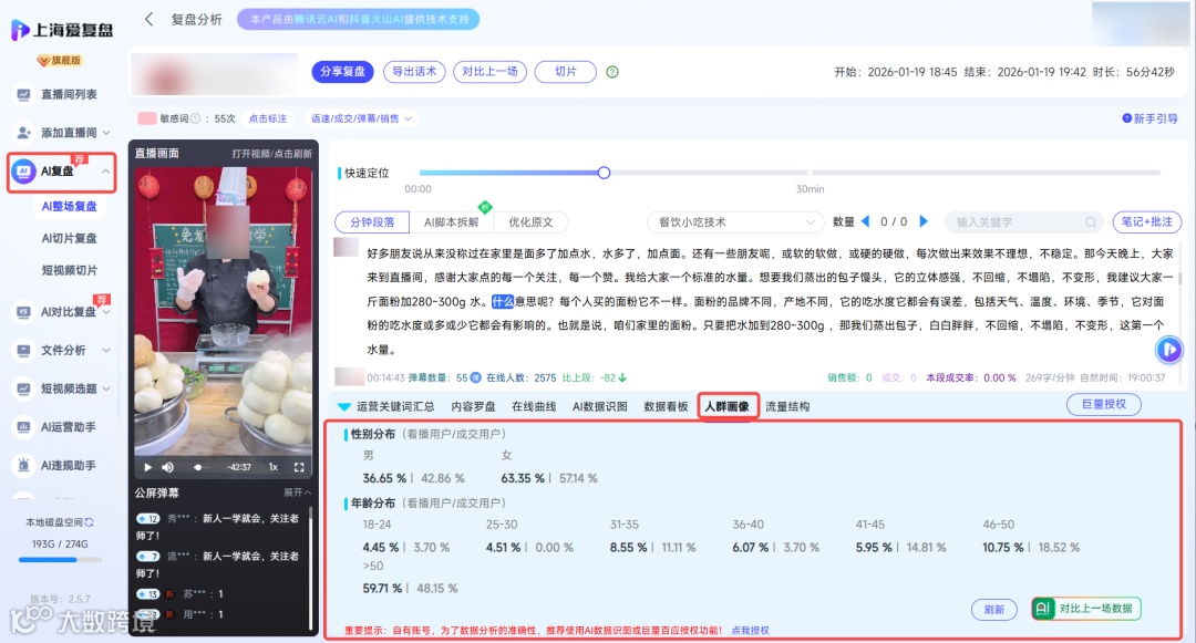人群复盘,爱复盘支持查看直播间人群画像,可以按人群特点调整直播内容和话术;根据用户的偏好和消费需求,调整互动方式和选品方向