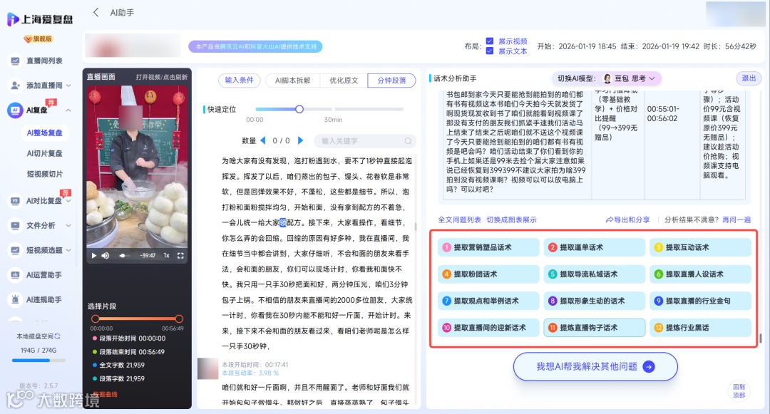 话术复盘,爱复盘支持脚本拆解,快速获取优秀直播间话术,也可以使用AI话术助手帮你提取并分析整场话术逻辑与问题,结合行业特点优化并输出主播所需话术,拿来即用,节省运营时间,提升沟通效率。