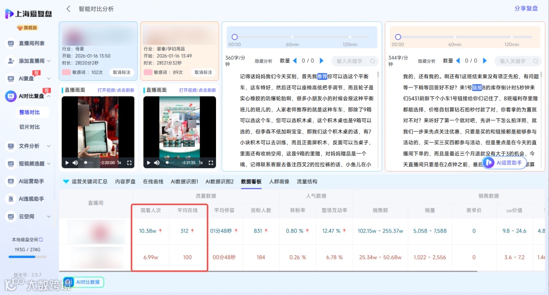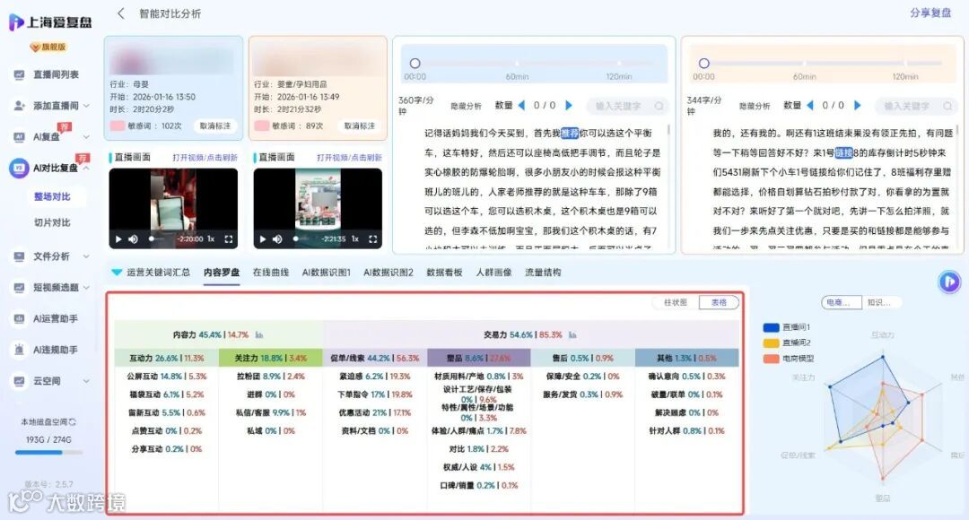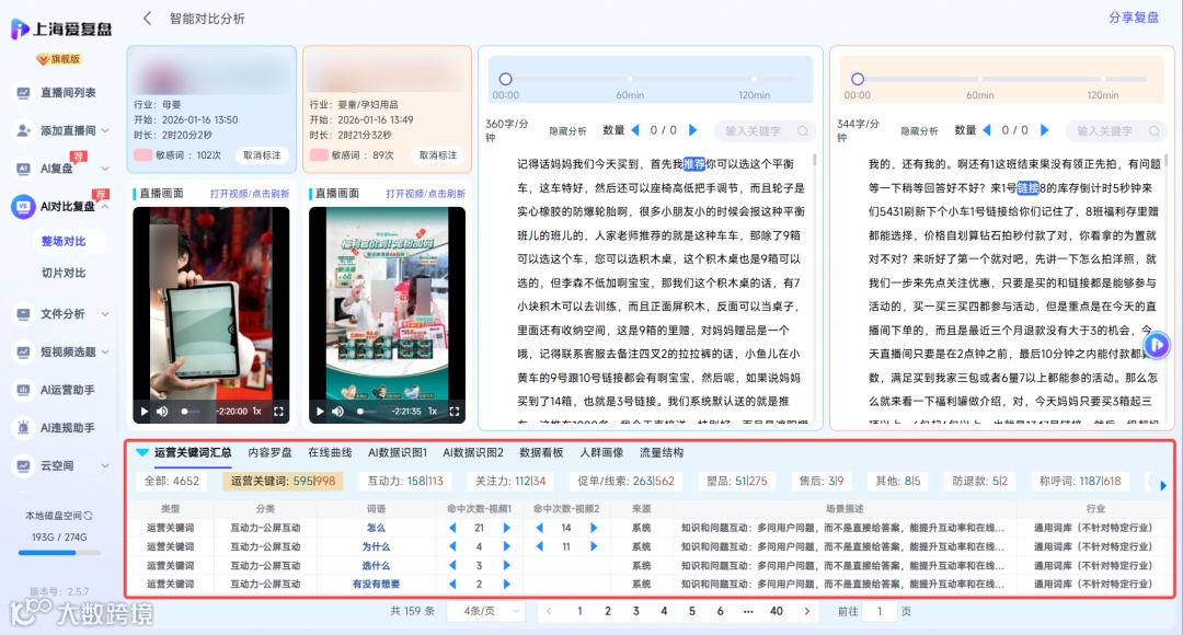 商品复盘,爱复盘支持快速直观对比两个直播间再互动拉新、促单,塑品等运营词关键词的提及次数和关键词差异性,快速定位问题。