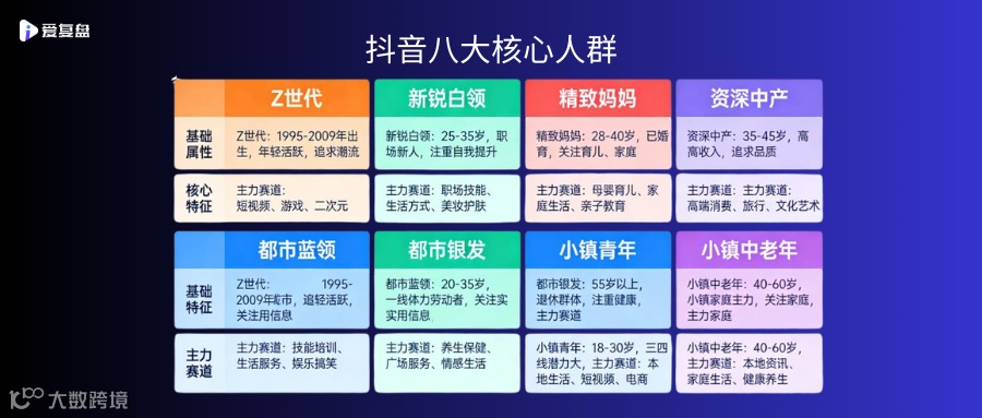 人群模型,核心解决流量精准度问题,抖音将用户划分为八大核心人群,各个人群有明确的年龄、特征和主力赛道,运营的核心是让直播间内容 / 产品与粉丝画像 + 兴趣标签高度匹配。
