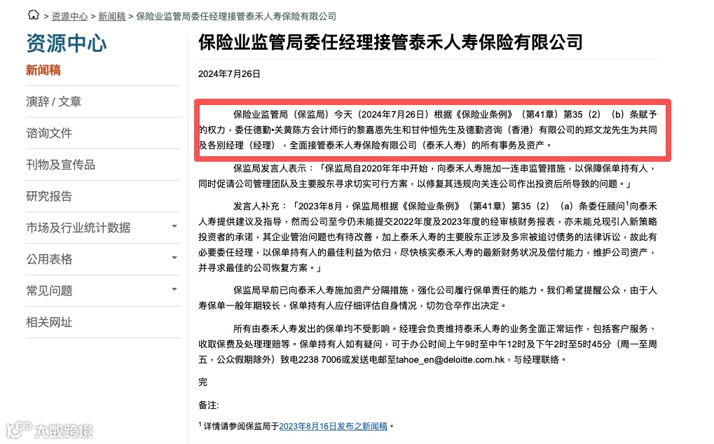 2024年,泰禾人寿因以22亿港元购入母公司高风险债券,致巨额亏损,负债达180亿港元,持有9万余份有效保单。香港保监局首次对寿险公司实施接管,委托德勤等专业机构维持运营,确保理赔、分红等服务持续正常。