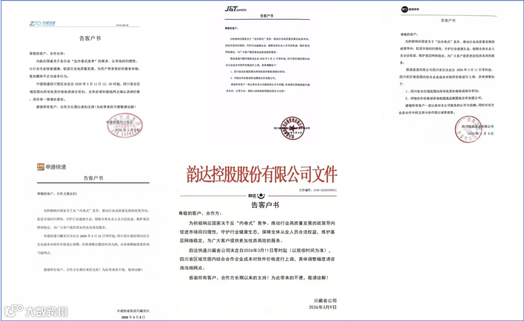 值得注意的是,中通、极兔、圆通公告加盖公章,而韵达、申通未盖章,引发业内对执行效力的质疑。但多位业内人士证实,此次调价确为四川省内五家快递省区公司协商达成的协同行动。