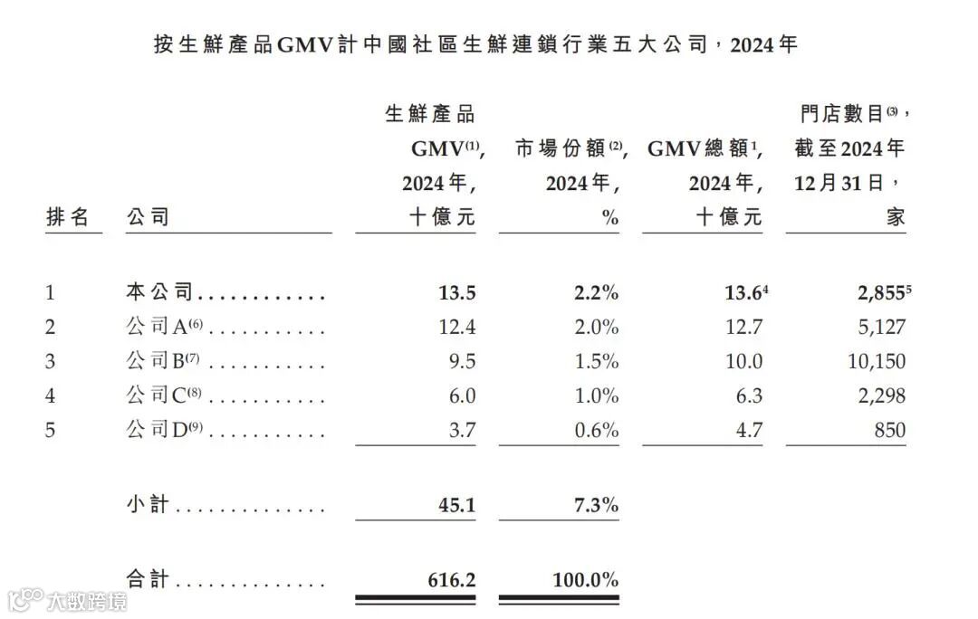 截至2025年9月末,钱大妈拥有门店2938家,其中98.6%为加盟店;2024年生鲜GMV达135亿元,占社区生鲜连锁行业2.2%份额;华南地区GMV高达98亿元,为第二名的2.8倍。