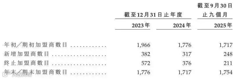 加盟体系持续失血:2023—2025年前三季度累计终止合作加盟商1159家;2024年新开354家,净增仅6家;至2025年三季度末,加盟店仅剩1754家。