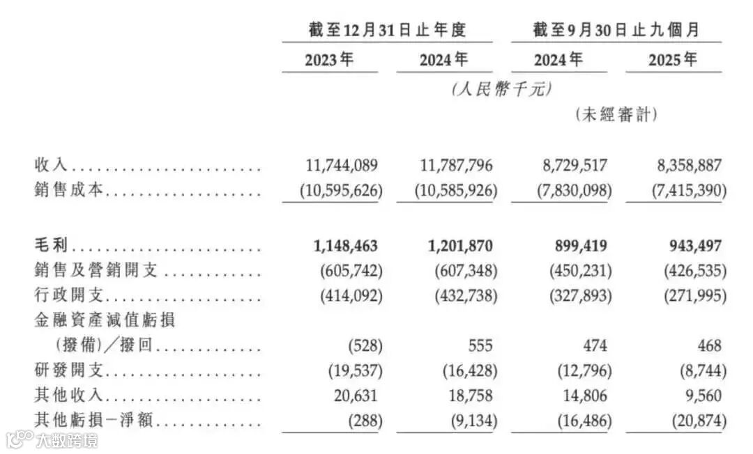 单店效能下滑明显:单店日均销售额由2023年的1.2万元降至2025年的0.9万元;整体毛利率虽微升至11.3%,但仍远低于商超行业15%–25%的平均水平。